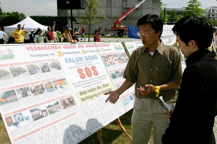 同时德国法轮功学员在总理府前举行集会。从十点到下午六点半,法轮功学员们在总理府前的草地上炼功,发传单,举行真人模拟反酷刑展,模拟摘取器官手术。