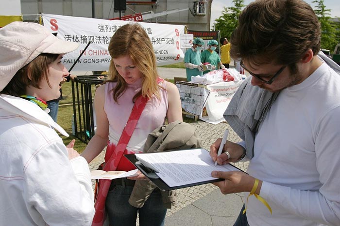 十几位德国中学生路过,听了学员的解说后,他们纷纷签名谴责中共盗取法轮功学员的器官。这些签名表将在总理梅克尔访华前夕递交给总理府。