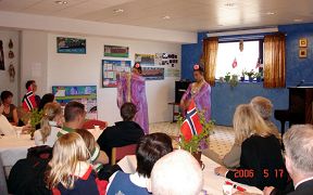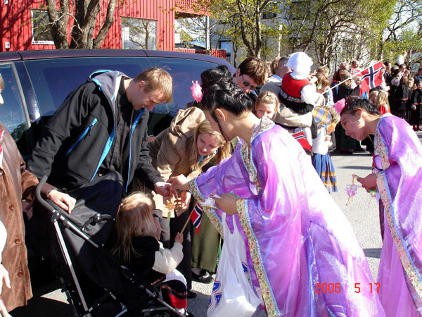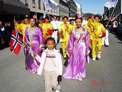 2006年5月17日下午,挪威北部博德市(Bodo)的法轮功学员参加了本市的欢庆活动。下午2时,在博德市的国际中心,学员们表演了文艺节目,包括腰鼓表演、功法演示、唐装舞蹈、二胡演奏,合唱“法轮大法好”和“为你而来”,演出受到了观众们的欢迎。