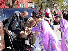![]() 法轮功学员在国际中心表演 | ![]() 向热情的观众们撒放莲花和洪法书签 |