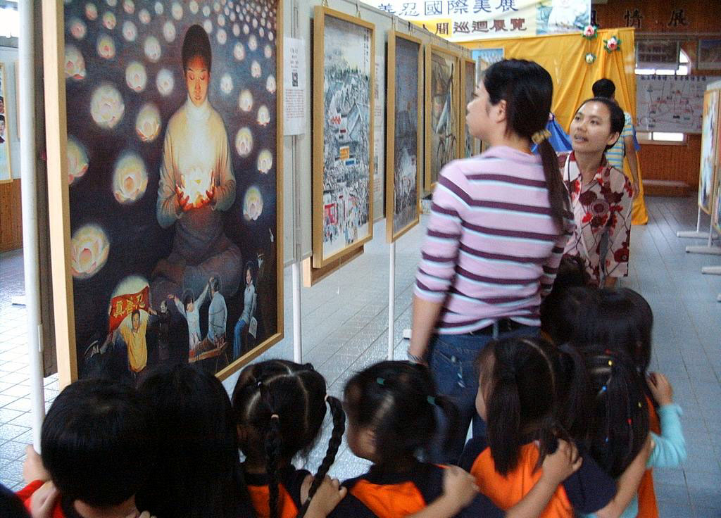 ![]() 老师带领学生观看“真善忍国际美展” | ![]() 台湾看美展的儿童 对比大陆受迫害的儿童 |