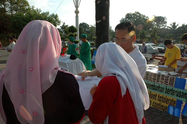 4月29日晚间,法轮功学员来到巴生市中心的夜市播九评,派发资料和征集签名。《九评共产党》第五评:“评江泽民与中共相互利用迫害法轮功”的音响传遍整个夜市。4月30日清晨六时,学员们来到巴生人民公园,首先为晨跑的人民播放九评。在播放一小时的九评后,法轮功学员在现场用麦克风以三种语言不停的讲述中共活体摘取法轮功学员器官的兽行,派发资料和征集签名,同时模拟中共摘取器官恶行,把罪恶曝光在民众眼前。