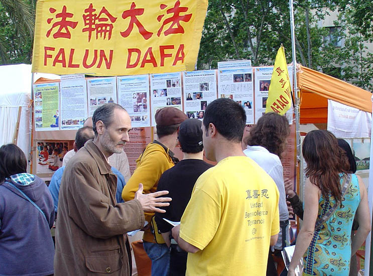学员们在主办者的理解和支持下,在会场的入口处摆放强烈谴责中共迫害法轮功的横幅和图片,使得每一位来此集会的人都有机会看到在中国正发生着如此令人发指的残酷迫害。善良的西班牙人被中共暴行震惊,纷纷签字声援法轮功学员,很多时候都是人们排着队在等候签名。