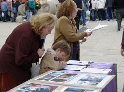 一位中年女士气愤的说:“难以想象,真不敢相信在今天这样和平的年代,在人人都倡导自由、民主的21世纪,竟发生了这样可怕的事情。他们(中共)真是比野兽还残忍。他们的罪行必须被制止。”一位摄影师,久久的站在图片前观看,并详细咨询更多的关于法轮功以及在中国被迫害的事,临走时他特地买了一束花送来,说是敬赠给法轮大法。还有一家祖孙三代一起来签名,在小男孩签名的时候,奶奶一直在旁边嘱咐他字要写端正写清楚,还告诉他这个签名意义很重大,是在做正义的事情。