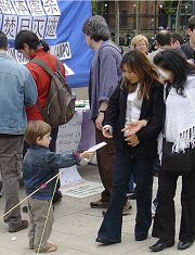 在集会上,法轮功学员们也遇到了不少中国人,他们大都高兴的接受了真相小册子及真相光盘,其中有位带着小孙子的老人对学员说:“共产党说法轮功不好,是什么什么教,但我不信共产党那一套,我要自己去了解法轮功到底是什么,为什么那么多人在炼。”老人表示希望能看到《转法轮》,学员答应第二天一定给他带来。