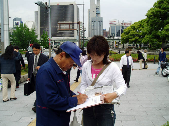 一个过路的日本人对法轮功学员说,她最近看了日本国家电台的一个报导,说是中共对外说在中国进行的器官移植供体都是经过本人同意的死刑犯,但据调查,中国的死刑犯每年只有三、四千人左右,但去年去中国做器官移植手术的日本人就有一万多人,因此不得不让人怀疑那些器官都是从哪里来的?今天听了你们的讲述才知道中国共产党竟这样的没有人性。难怪听说日本人去中国做器官移植手术的成功率都很低,从活人身上摘的器官能没有怨气么!