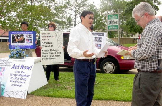 王医生上个月在布什总统举办的一个新闻发布会上高声抗议中共领导人胡锦涛。居住在田纳西州的法轮功学员爱德华-魏说,王医生抗议(中共)摘取器官。