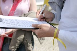 ![]() 记者录法轮功反迫害的脚步 | ![]() 带着黄丝带的签字反对迫害 | ![]() 中学生高兴的带着黄丝带留影 |