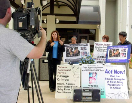 播音员最后说,抗议者们表示,法轮功学员在中国被监禁、被折磨、甚至被中共当局杀害。