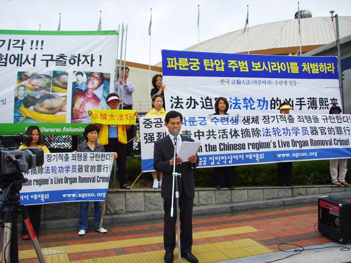 接着,崔先生代表全体韩国法轮功学员宣读了谴责恶人薄熙来的声明书。声明书中列举的薄为了个人名利,自1999年以来对国内外众多无辜的法轮功学员所犯下的血腥罪行。声明中说,薄熙来的访韩是韩国人民的耻辱,薄应立即离开韩国。