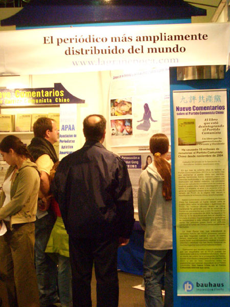 大纪元摊位不仅展出西文的《九评共产党》,并且提供大纪元领先报导中共退党大潮的最新资讯以及关于中共劳教所活体摘取法轮功学员器官贩卖的情况,以便广传这被中共封锁的暴行真相。在这两个礼拜以来,摊位吸引了很多人, 仔细的阅读真相资料。一般阿根廷人都有对神的信仰,因此对中共活体摘取器官的行为纷纷表示这已经是魔鬼的行为了。