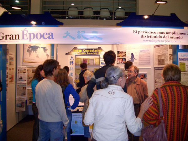 【明慧网二零零六年五月四日】阿根廷大纪元时报第一次参加拉丁美洲最大的国际书展并且推出西班牙文的《九评共产党》,使广大的西语读者更进一步的了解中国共产党57年以来的暴行,以及为什么中共不能代表中国,没有共产党才有新中国。揭幕典礼时大纪元赠送给光临的副总统,教育、外交部长及各界政要等西语的《九评共产党》及有关退党、中共活体摘取法轮功学员器官罪行的真相资料。他们都亲手接过这些资料。
