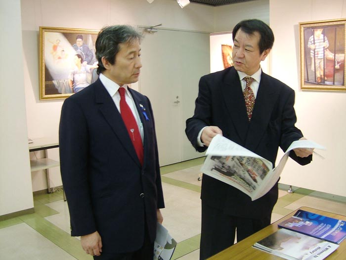 木村三浩先生还特别对法轮功学员表示:我不知道有多少日本人能够与你们共享法轮功的美好和共同感受法轮功学员受迫害的痛苦。但是我仔细的看了这里的画,我就知道了你们是承受了中共强加给你们法轮功多大的痛苦了。我希望你们要把这样的画展继续办,第八次、第九次、第十次、一直办下去。让更多的日本人知道中共的本质。