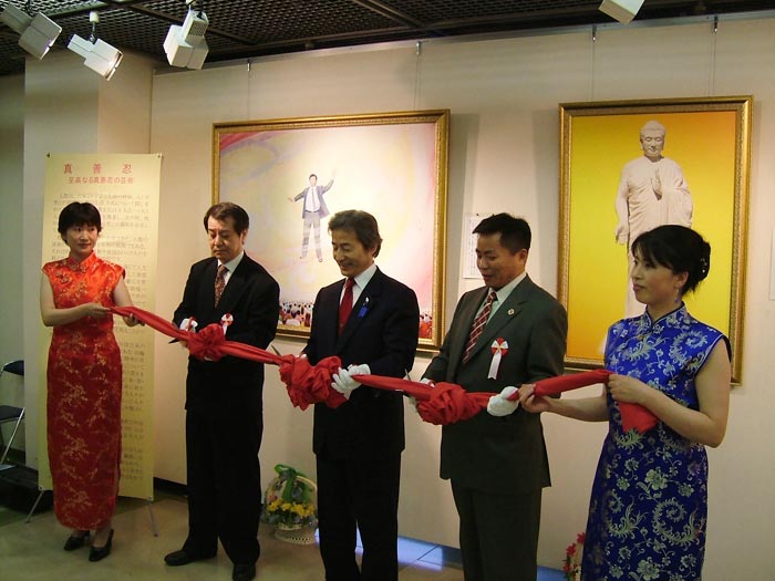 法轮功学员代表佐藤国男先生在剪彩仪式上首先对每一位冒雨前来出席开幕式的来宾表示感谢,并介绍说:法轮功自1992年由李洪志先生从中国传出以来,有上亿人以人传人、心传心的方式传遍了全世界七十多个国家和地区。然而唯独中共江氏集团自1999年7月开始对法轮功进行疯狂的镇压和迫害,至今已持续近七年。我们日本学员一直坚持对日本的上至国会议员下至村町的国民不断的讲清真相,故而再一次迎来了今天“第七回真善忍国际美术展”活动。佐藤国男强烈谴责中共正在进行着的极为残暴的活体摘除法轮功学员脏器、牟取暴利、焚尸灭迹的罪恶行径,呼吁日本政府和人民进一步了解法轮功受迫害的真相,帮助共同制止这场反人类的浩劫。