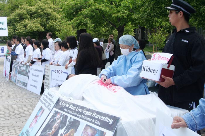 法轮功学员在联邦法庭前模拟演示中共活体摘取、贩卖法轮功学员器官的血腥暴行。