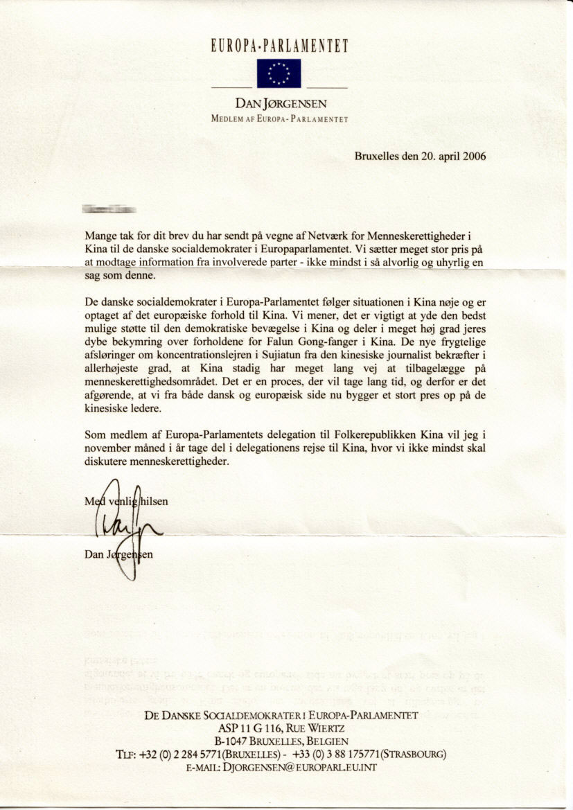 丹麦社会民主党的欧盟议员们一直密切关注着中国的情况,并且非常重视欧洲与中国的关系。我们认为尽最大可能的去支持中国的民主运动是非常重要的事。同时,与你们一样,我们对法轮功学员目前的处境也深深感到焦虑。最近由一位中国记者揭露出来的,在苏家屯集中营发生的残忍事件,已经清楚的表明,中国在人权问题上还有很长的一段路要走。这是需要很长时间的过程。因此从丹麦和欧洲方面对中国领导人形成一种压力就变的十分必要。