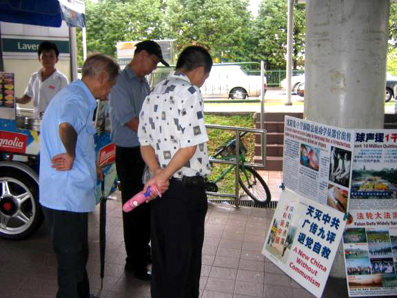 有中国人说,你们的资料我都看了,我在四马路就看到过你们了,你们辛苦了啊。有2个年轻的中国人,一开始给他们资料,不敢拿。但一直在展板旁边转来转去,最后说,给我们一份资料吧。有些中国人蹲在那里,每一幅展板都很仔细的看,生怕漏下什么。有个十几岁的女孩,很专注的看着展板,听学员的解说,最后表示退出少先队。
