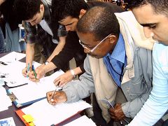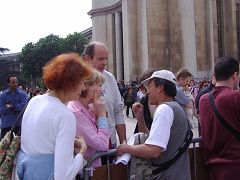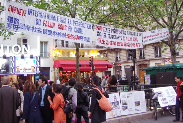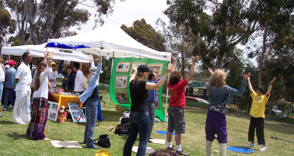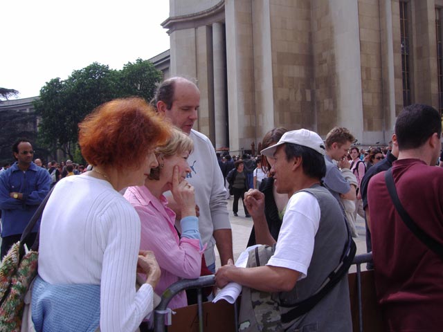 学员看了看他,有感而发:“我看你长的方头大耳的,很庄严,说不定前世你也是修炼人。”对方回答“谢谢。”学员说:“真可惜你生在一个无神论的国家,都忘记修炼了。”对方似乎受到一阵触动,后来与同行的几个人讨论后,把欢迎的旗子收起来,离开了。