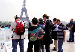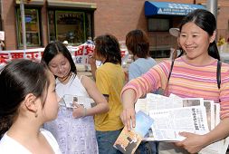她过去和其中一位聊,说:“你不要相信我,因为我是炼法轮功的,我会说法轮功好;你也不要相信共产党,因为共产党不喜欢法轮功,所以它说法轮功不好。现在你遇到两种不同的意见,怎么办?我建议你从头到尾把法轮功的主要书籍--《转法轮》看一遍,再来说法轮功好不好,我尊重你的判断。”同时也跟他介绍了《九评共产党》。那位中国人说,他回去会把这两本书看完。