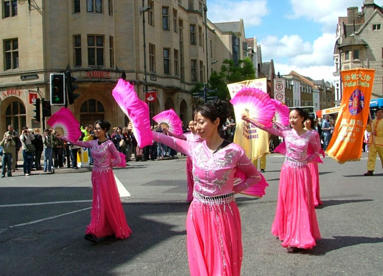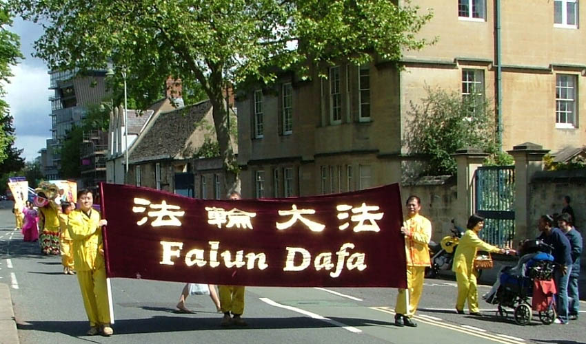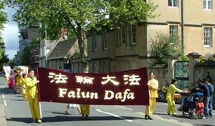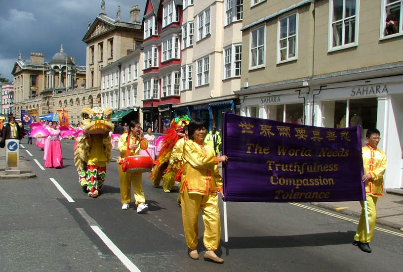 上午11时许,游行开始。法轮功团体位于游行队伍的中间,由写有“法轮大法”和“世界需要真、善、忍”中英文的两面横幅领头,后面是两只雄狮表演舞狮,和随着“法轮大法好”音乐翩翩起舞的扇子舞队,紧接着的是“法轮大法使全世界亿万人身心健康”中英文横幅和多面色彩鲜艳的法轮旗。游行队伍经过了牛津市中心的步行街Cornmarket Street和商业街High Street,途经多所牛津大学学院,来到终点南方公园(South Park)。