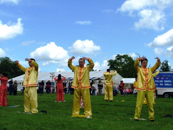 ![]() 游行队伍穿过牛津市中心 | ![]() 学员为人们演示法轮功功法 |