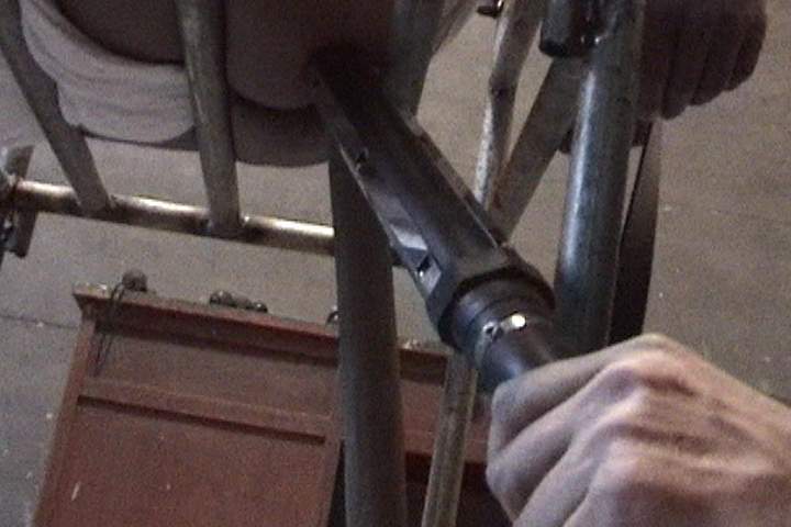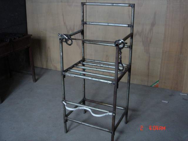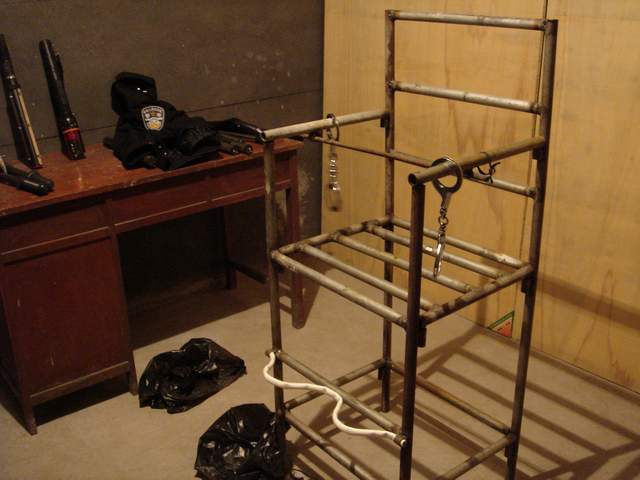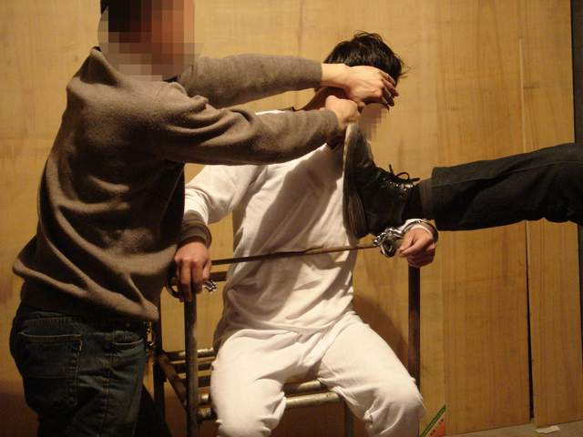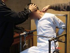 恶警们把雷明架到车上,劫持到长春市公安局。接着又把雷明架到大约六层楼的一个房间里,将他绑在老虎椅上。铁老虎椅比一般椅子高很多,得有人抬才能坐上去。坐上之后双脚离地,然后将双脚固定到椅子腿上。再用一根铁棍(同大门的门闩相似)紧紧贴着小腹,横穿在两扶手内侧的孔上。再用锁头锁上,双手反背铐在椅背上。一恶警拿着带尖的电棍在雷明脖子后面猛电了数下。(图为法轮功学员重组酷刑演示)