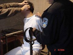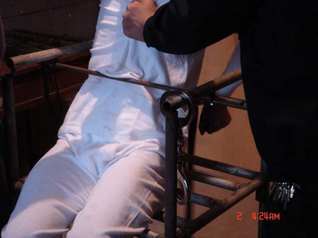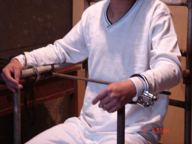 恶警们把雷明拽下车拖到一个房间里,房间里摆放着铁老虎椅、电棍、塑料袋、大铁桶、电炉子……从房间的简单装潢看,好象是一个酒店的包房,而且比较陈旧,没有暖气,好象早已不经营了。恶警把雷明抬到铁老虎椅上,然后用根细绳把雷明的双脚绑紧,而后用铁棍(同市公安局的那个一样)在扶手底下的孔上,紧贴在小腹处穿过,用锁头锁上。紧接着又给雷明用了更狠毒的一招,将他双手反背着,两腋窝卡在椅背上,然后用一条牛皮带从手铐中间穿过,经椅子腿的横穿上绕上来,两恶警恶狠狠的使劲地往下拉牛皮带,企图将牛皮带拉到最紧的程度扣上。由于手铐的铁环硌在腕骨上,胳膊筋也被抻着,致使雷明疼痛难忍,雷明用尽全身力量拼命反抗,恶警们没有得逞。其中一个气急败坏的恶警用脚猛踹手铐,才将牛皮带扣到极限,当时雷明痛的几乎昏了过去,汗水湿透了全身,那种痛苦真是难以言表。此时雷明的身体已丝毫不能动了。