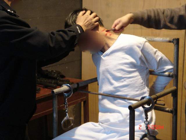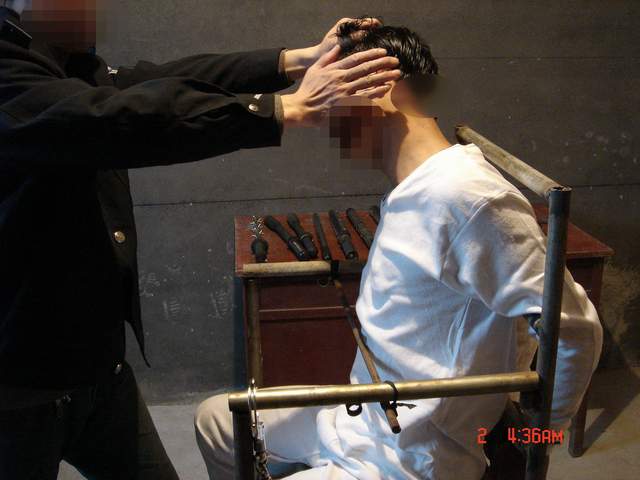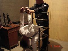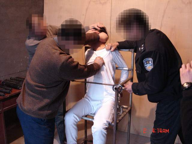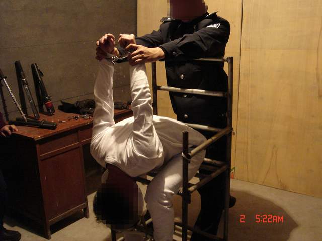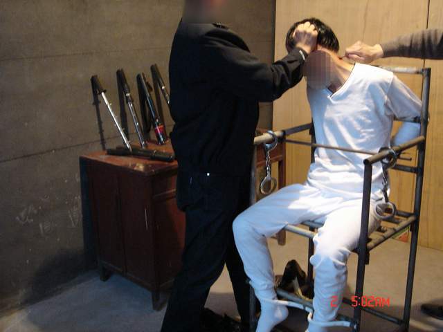 恶警还用一个木棍的一端插在肛门上然后另一端卡在椅背底部的横梁上,再用电棍电击肛门,使雷明更加苦不堪言。