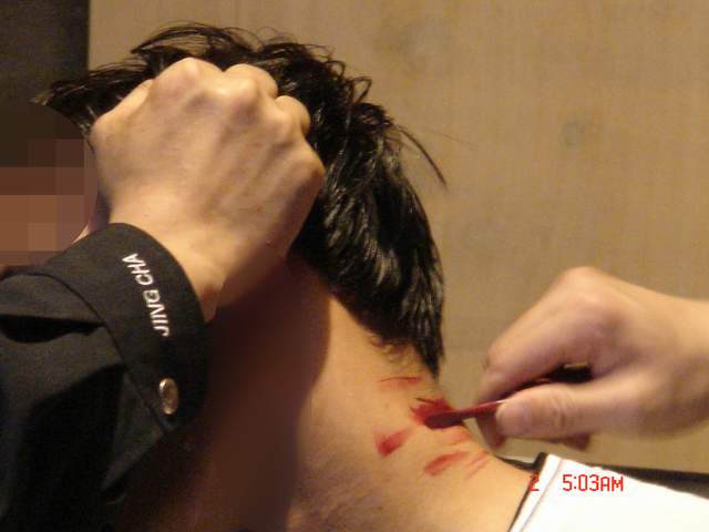 这时又换了两个恶警用塑料袋套住雷明的头,紧紧不透一点空气使雷明憋的透不过气来,致使他憋得要咽气了。这时恶警们突然松开塑料袋,雷明刚刚喘了几口气就又被套上了。就这样不停的反复折磨,直到电棍充完电,就又换上刚才那两个恶警。恶警们觉得那邪恶的程度不够,便拿来一个扁头螺丝刀在电炉子上烤,然后再往雷明的脖子上烫,烫的肉皮脱落。