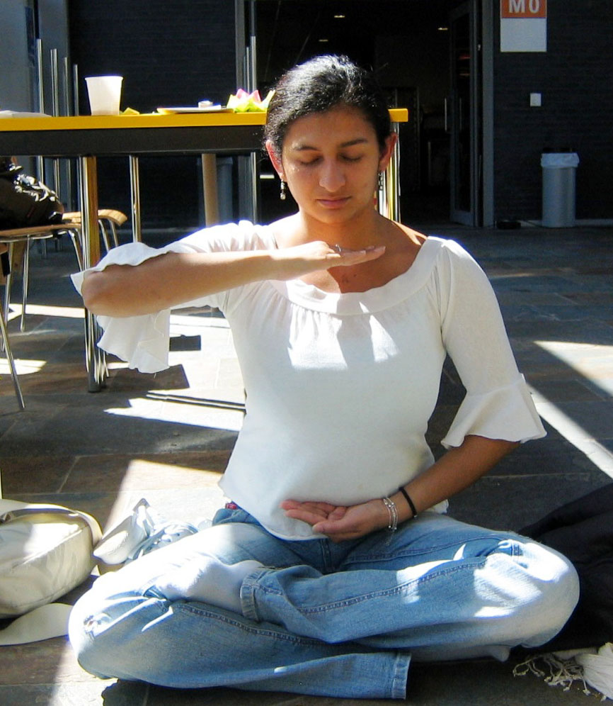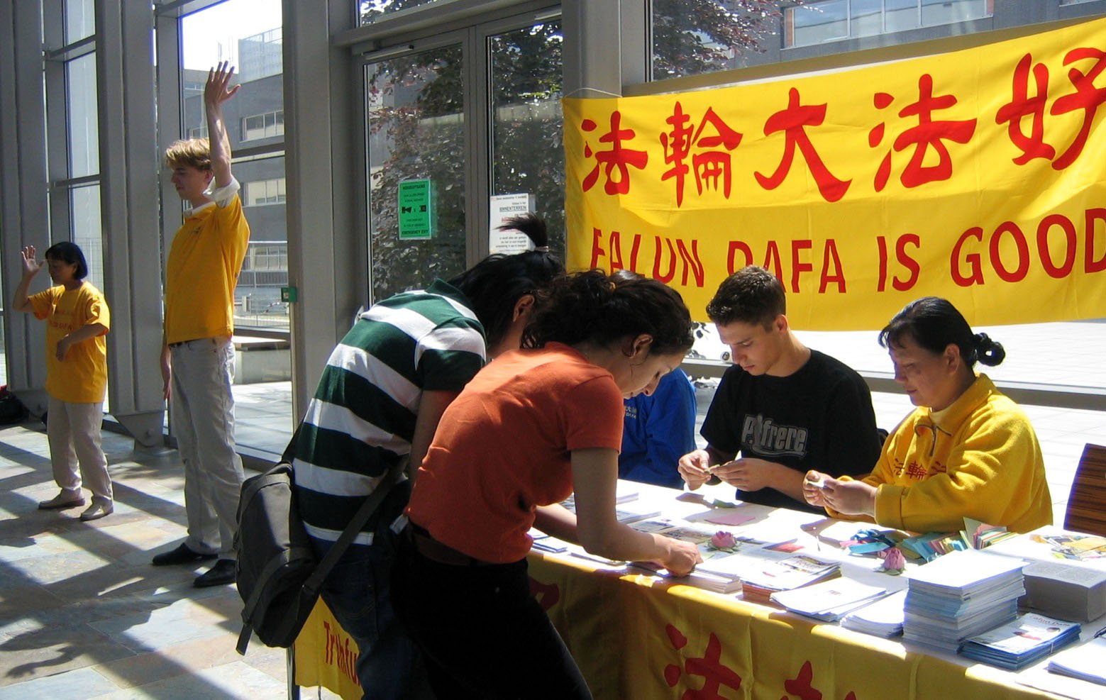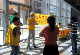 大厅中,学员们优美的炼功动作、美妙的音乐、醒目的黄色横幅及图片展吸引了许多来往学生和老师们的目光,他们主动到展位询问更多信息。