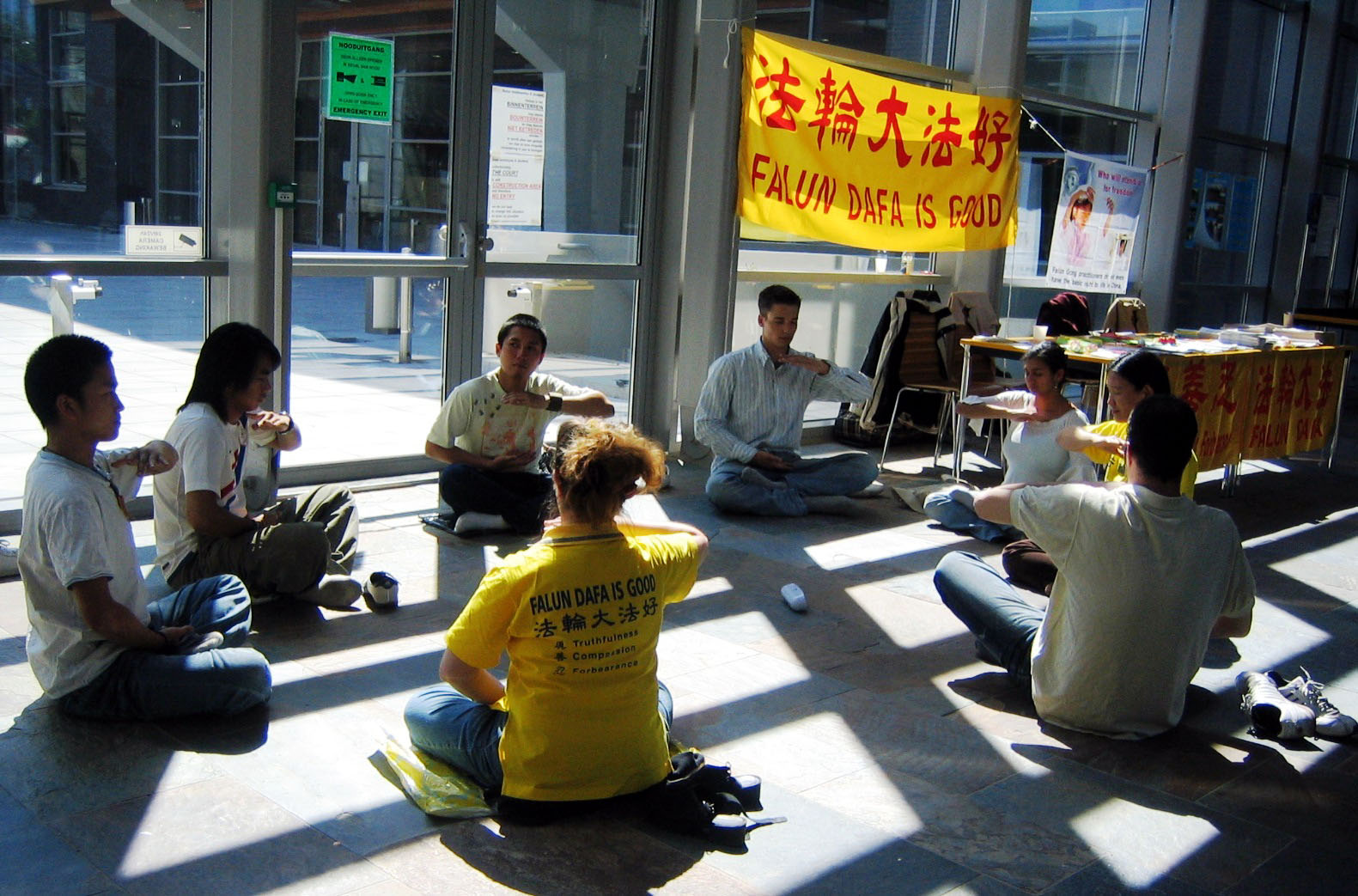 ![]() 认真学功的女大学生 | ![]() 法轮功学员在大厅设置展位并进行功法演示 |