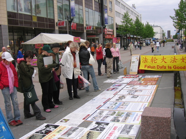在图片展旁,也有学员展示祥和的功法,一位男士被深深的吸引了,当场请了《转法轮》书和所有资料,并要求学习功法,经与学员商定,下周三学员将来高沃拉办班教功。这位芬兰人高兴的把好消息告诉了他的朋友们,他说下周三会有许多人来学。