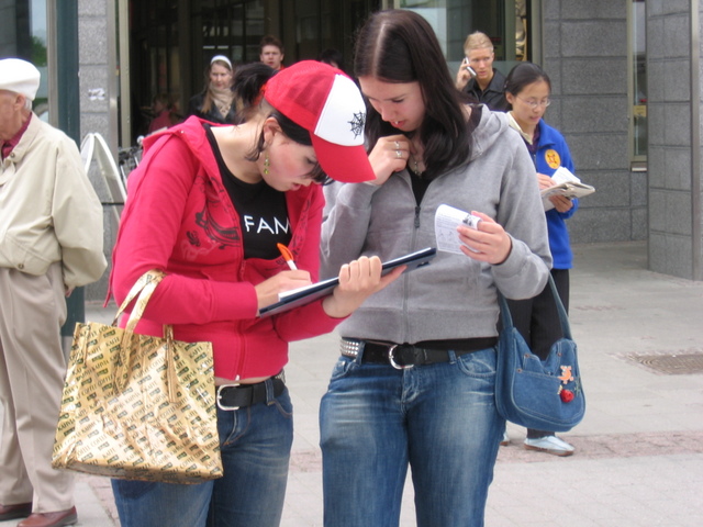 更有许多芬兰小朋友认真阅读展板和资料,然后签名声援。还有的向学员索取更多资料要分送给同学和朋友。