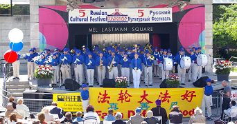 这是多伦多法轮功学员首次参加俄罗斯传统文化节的活动。多伦多天国乐团上台表演,雄壮、嘹亮的乐曲博得观众的热烈掌声。