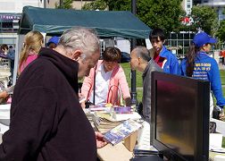 有些观众在观众席上已经开始阅读法轮功的介绍资料;法轮功学员在文化节上的摊位也吸引了不少来了解相关信息的人。