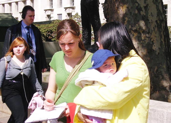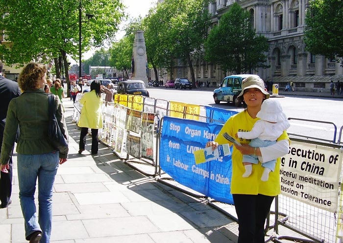 学员们申请的时间是周一至周五的下午2点到6点。在这个时间段里有大量的下班人群及游客。也因为这个时间段的关系,很多伦敦学员还在上班无法前往。这样一来,前往的学员多是不上班的带小孩的妈妈,和已退休的老年学员。这些法轮功学员们在风雨无阻的讲真相中,使该区域众多政府部门大楼上班的工作人员和来来往往的其他上班族群中的许多人拿到了法轮功真相传单,看到了学员们展示的祥和舒缓的法轮功功法,看了在唐宁街10号——首相府的街对面设立的小型图片展。