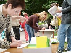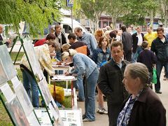 学员们把展现大法美好和揭露中共对法轮功迫害真相的展板摆放在活动现场。因活动地点在一个市场附近,来往的人多,使很多人知道了真相,人们纷纷签名支持法轮功反迫害。