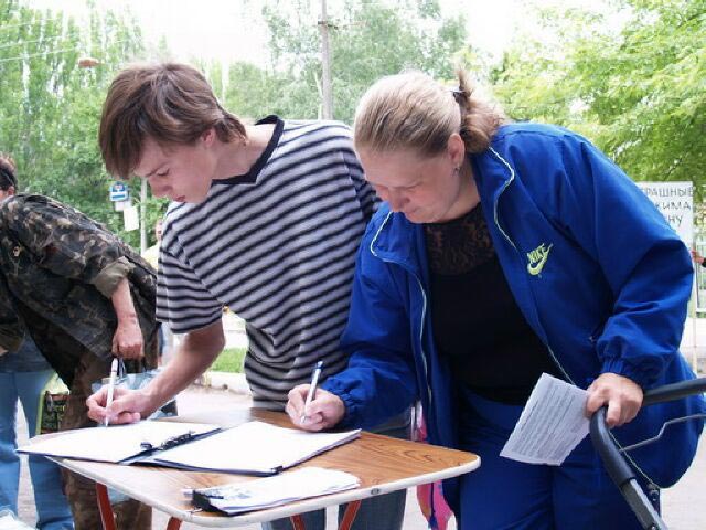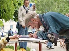 ![]() 饱经风霜的老人也认真签上自己的名字,支持法轮功反迫害 |