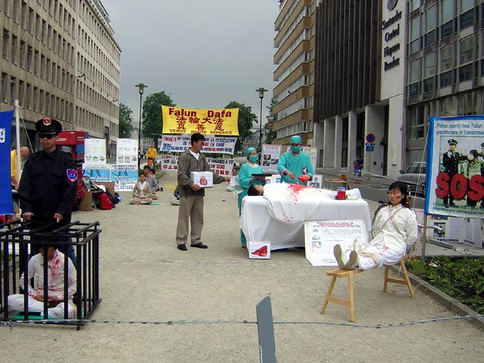 学员们以真人模拟的方式揭露中共活体摘取器官牟利,并做了铁笼和老虎凳两种酷刑演示,活动场地摆放了多张触目惊心的法轮功学员被迫害的图片及解说展板。学员通过高声喇叭用英、法两种语言交替广播,内容包括揭露中共活体摘取法轮功学员器官的证人证词;调查真相报告,包括欧洲议会副主席麦克米兰·斯考特先生近期在北京对法轮功学员受到的迫害的实地考察等等。