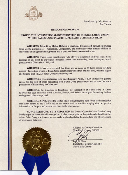 纽卡斯县议会议员凯伦·瓦伦斯吉(Venezky)女士和议员威廉·覃斯(Tansey)支持了此决议案。这是暨特拉华州威明顿(Wilmington)市议会于6月1日通过有关此议题的决议案后的另一决议案。瓦伦斯吉女士褒扬了法轮功学员,她说,法轮功学员是当地良好的居民,他们通过修炼法轮功提高自己的境界,多年来持续进行制止迫害的努力。瓦伦斯吉女士指出,纽卡斯县议会通过决议案,将最近曝光的(中共秘密)集中营活体摘取法轮功学员器官的事提请社会关注,也希望通过这一行动和其它各地的努力汇合,敦促进行独立调查行动,停止对法轮功的迫害。