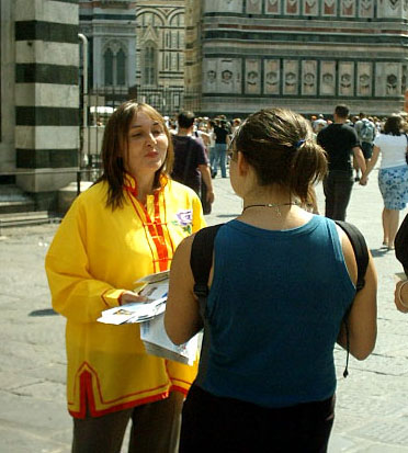 西人法轮功学员娜塔莎在佛罗伦萨市中心向世人讲真相