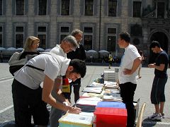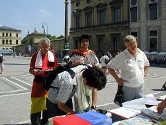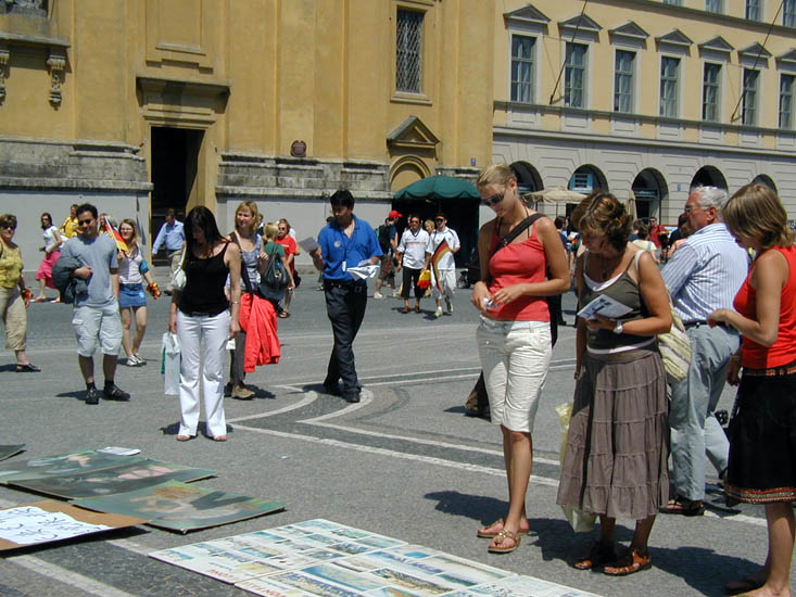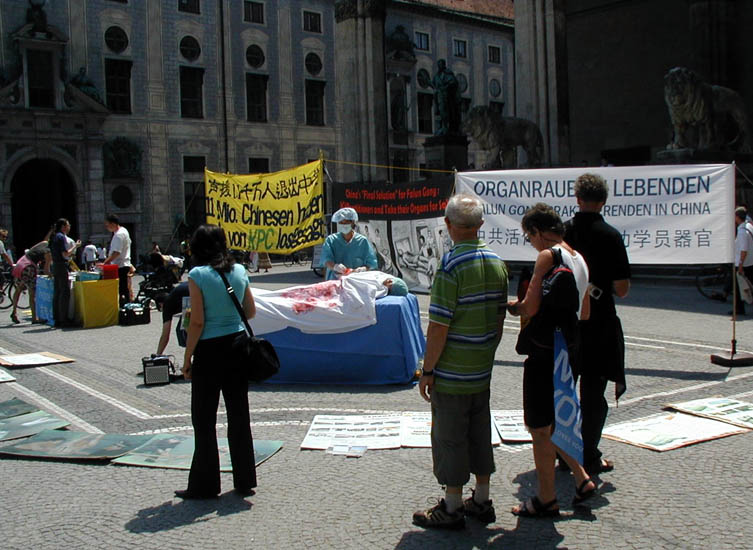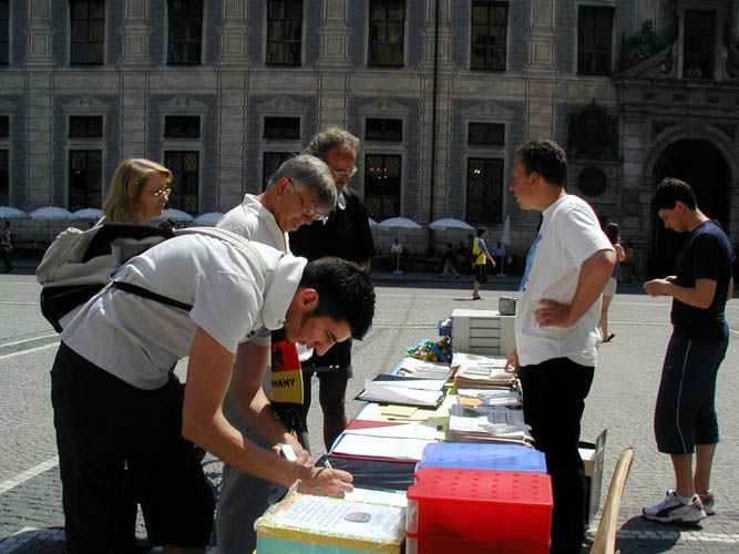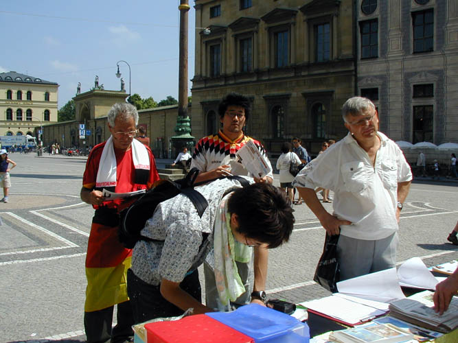 2006年6月24日,世界杯足球赛东道主队在慕尼黑(Munich)迎战瑞典队,赛前来自德国各地和全世界的球迷蜂拥而至,在慕尼黑市内的大街小巷浏览观光。借此机会,法轮功学员和大纪元时报在欧地安斯广场(Odeonsplatz)共同举办了揭露迫害、声援退出中共的活动,在各界民众面前揭露中共暴政的真面目。