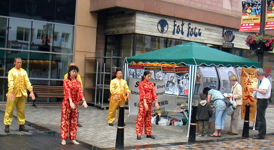这一天,信息展位的四周挂出了曝光中共在劳教所、秘密集中营等地活摘法轮功学员人体器官的图片海报,和揭露中共劳教所对法轮功学员所施酷刑手段的图片。一些学员向路人发送传单、讲真相;另一些学员向人们展示祥和的法轮功五套功法,有的路人当即停下来学功。不少人在得知迫害真相后,主动在呼吁书上签名声援反迫害。