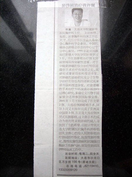明慧网2006年5月27日文章名为《中共喉舌自曝器官移植疑点》报道大连某某附属医院给两名需要移植心脏和肺脏的病人做移植手术。此文中提到的医院名称应该是大连大学附属新华医院(原老五院)。在6月13日的大连半岛晨报B46版专家档案中详细介绍了做肺移植手术的医生许凝的情况。原文如下(附件中为数码像机拍摄的报纸原件)