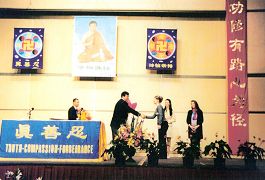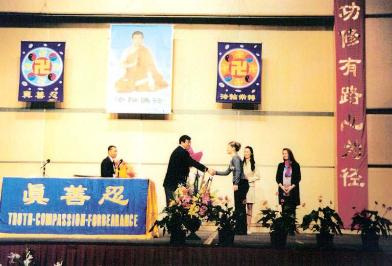 这时门外的中外记者又一次要求進会场面见师父,师父当时让弟子转达给记者,欢迎他们来会场,但是希望他们先听听学员的发言,对法轮功稍有了解之后再见面。于是有些记者進入会场就座,听取学员的交流发言,后来一位记者也得法了,成为了一名大法弟子。