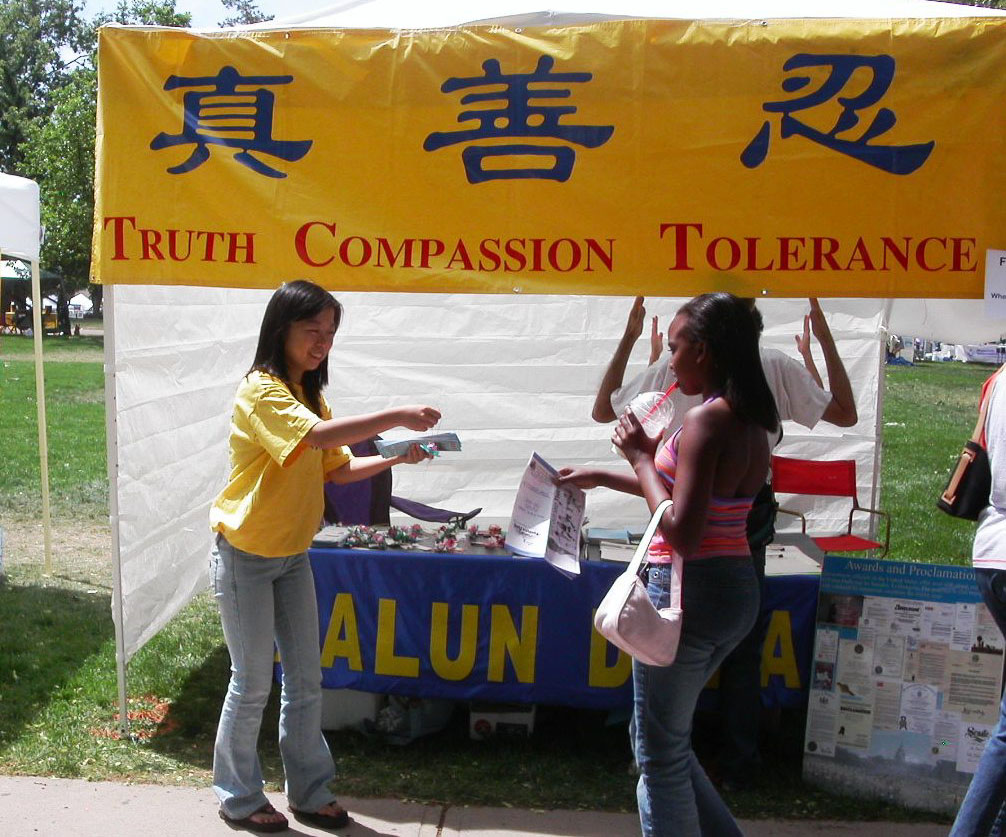 【明慧网2006年6月9日】2006年6月3日-4日,美国科罗拉多州法轮功学员参加了该州最大的集市--州府民众集市,至少有25万人参加此次集市。法轮功学员设置了摊位,向民众介绍法轮大法、演示五套功法,并发放揭露“中共活体摘取法轮功学员人体器官”的真相传单。