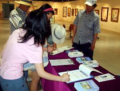 ![]() 参观者 | ![]() 参观者在营救被中共非法判刑的大法弟子金学哲的征签表上签名 |