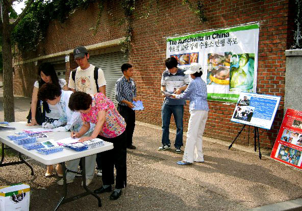 法轮功学员们还在通往大学的路上摆设了真相展板,并在校门前放置了揭露中共集中营、劳教所的真相资料,而在展厅内则有征集营救被中共非法判刑的大法弟子金学哲的签名活动。