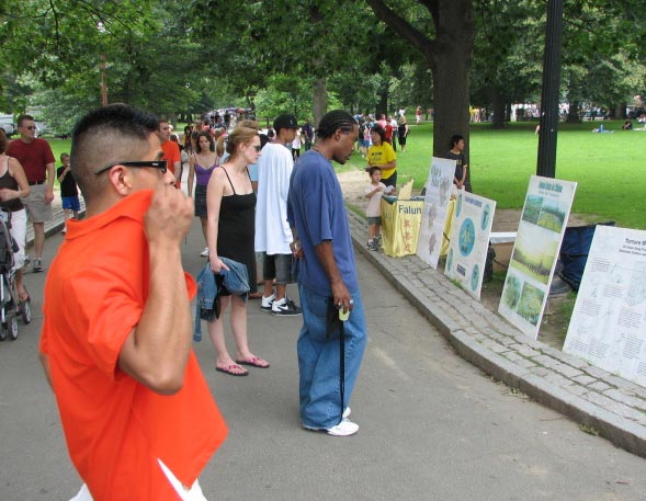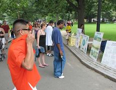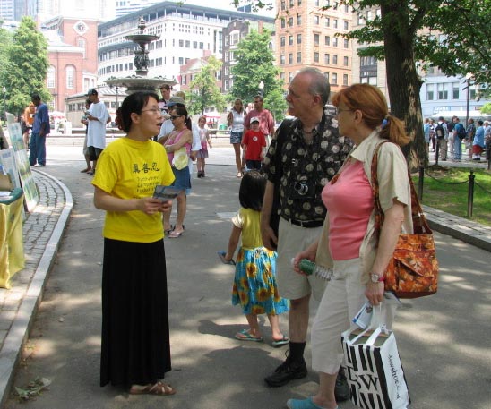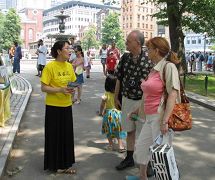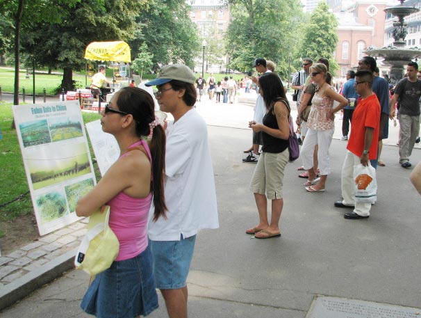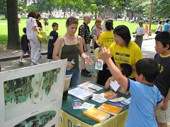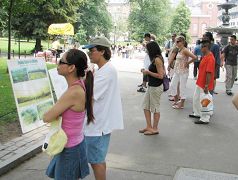 多数路经者在真相展板前驻足,阅读。学员们轮流派发真相资料,解答问题。很多人得知真相后,主动在给美国政府和联合国的“制止发生在中国的屠杀”呼吁书上签名。