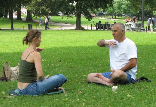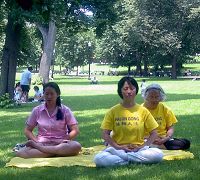 ![]() 路人(左)当场学习法轮功功法 | ![]() 功法演示 |
